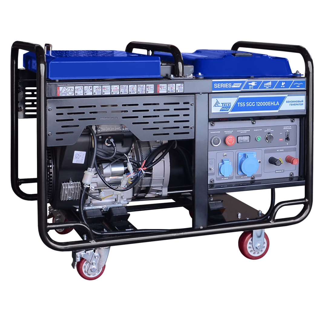 Бензиновый генератор TSS SGG 12000EHLA - мощная электростанция на 12 кВт с электростартером, которая позволяет реализовать различные варианты подключения нагрузки и отличается высокой мобильностью за счет колесного комплекта.